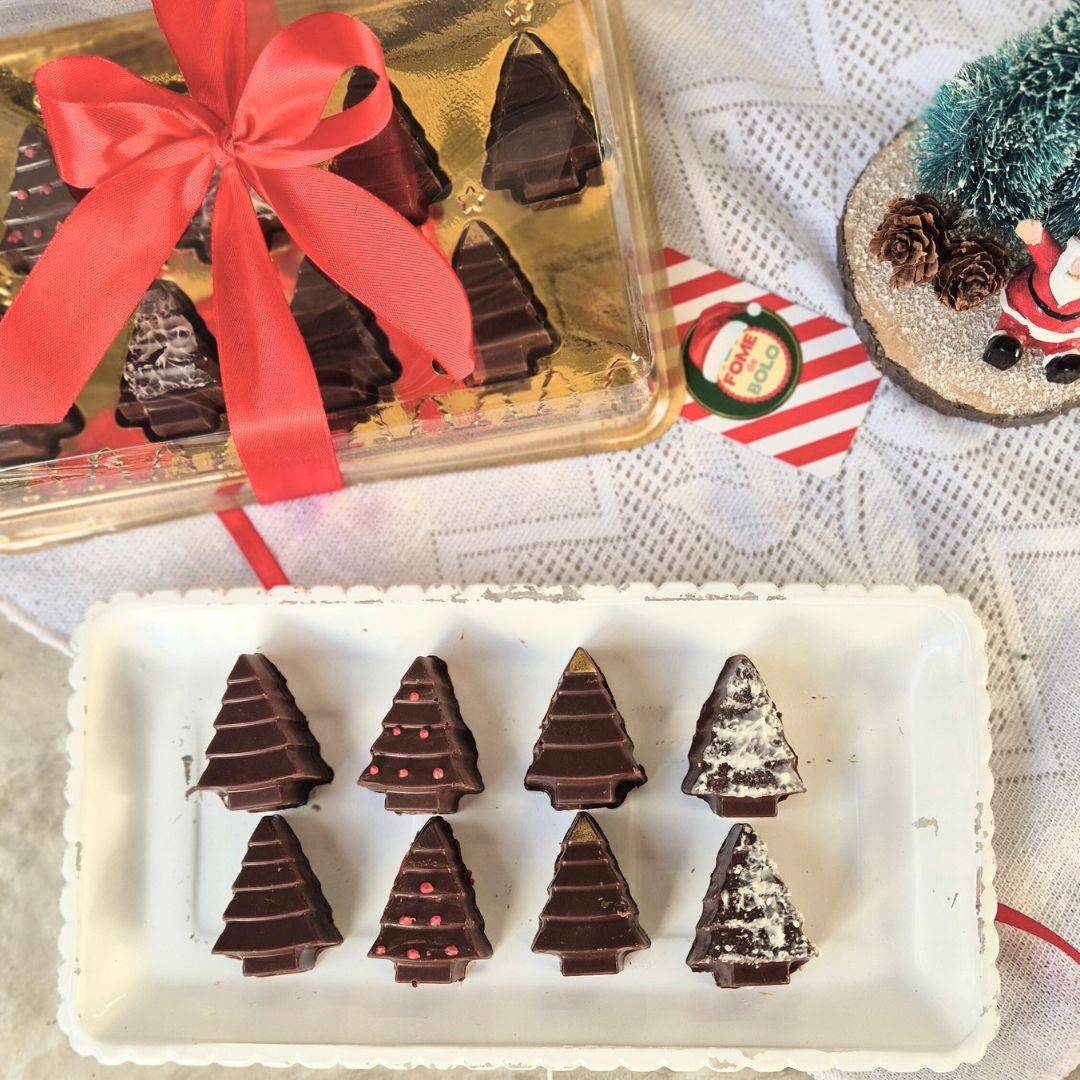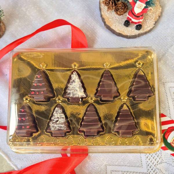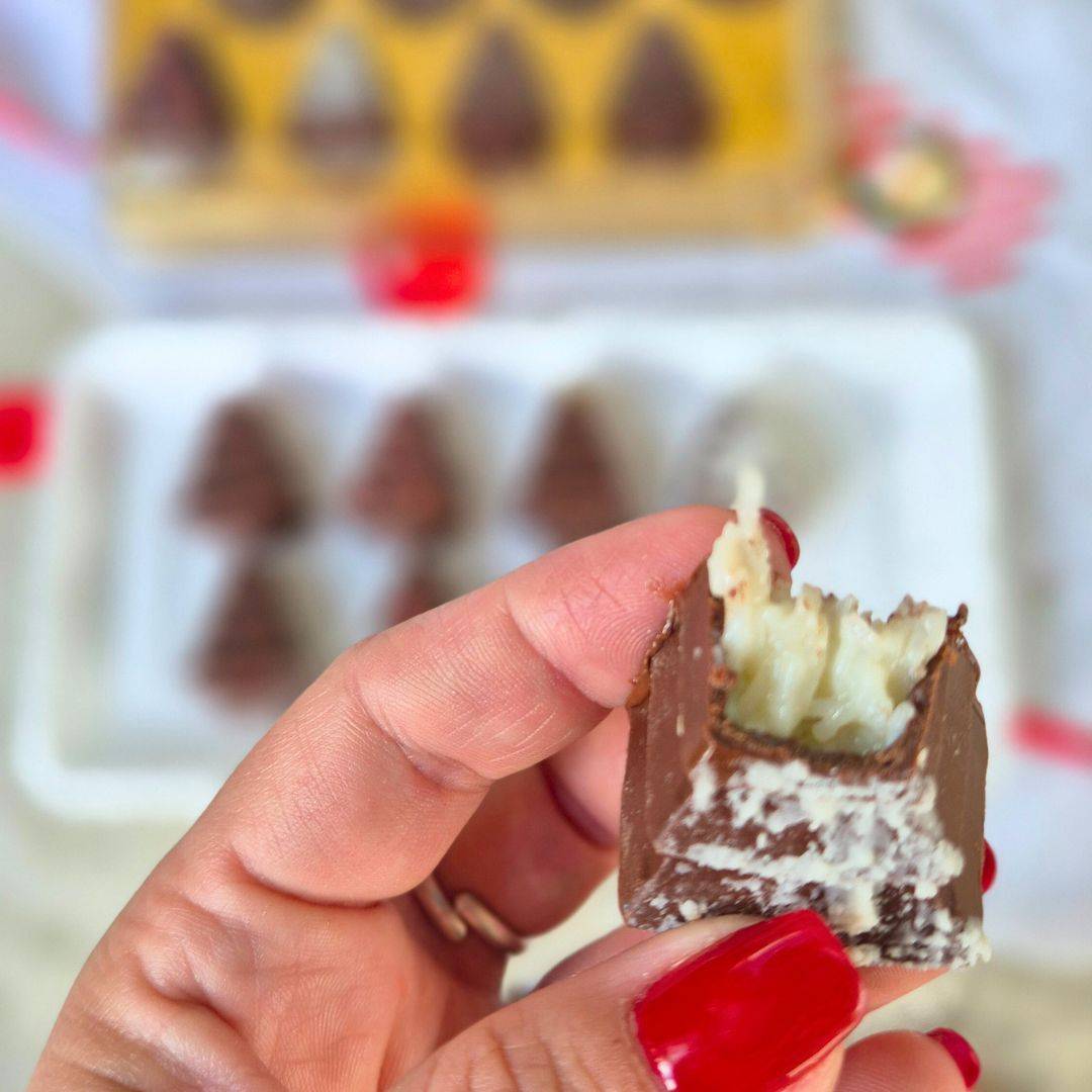 8 Bombons de chocolate nobre com recheios de, caramelo, brigadeiro, coco e nozes.