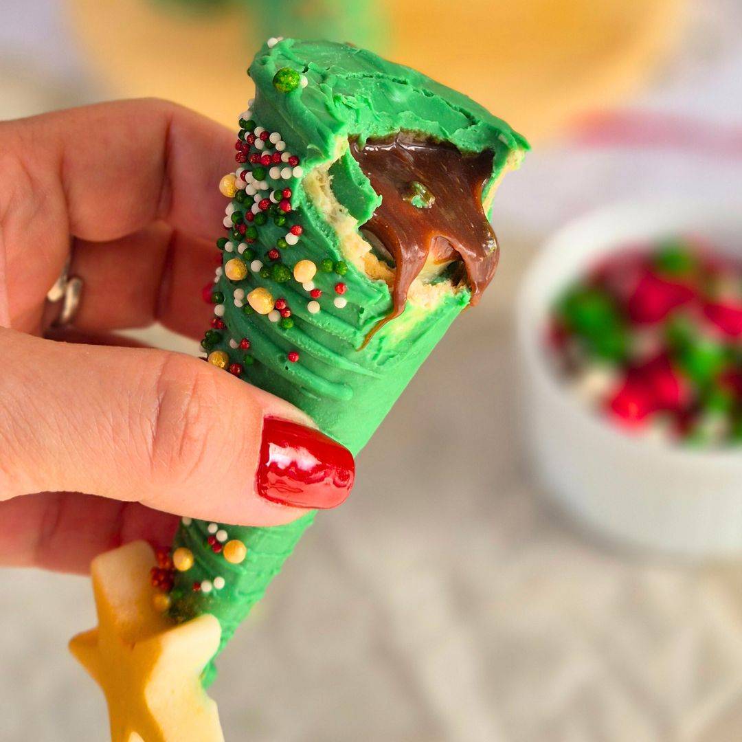 Casquinha de sorvete, recheio de creme de chocolate branco e preto, banhado em cobertura de chocolate (corante).